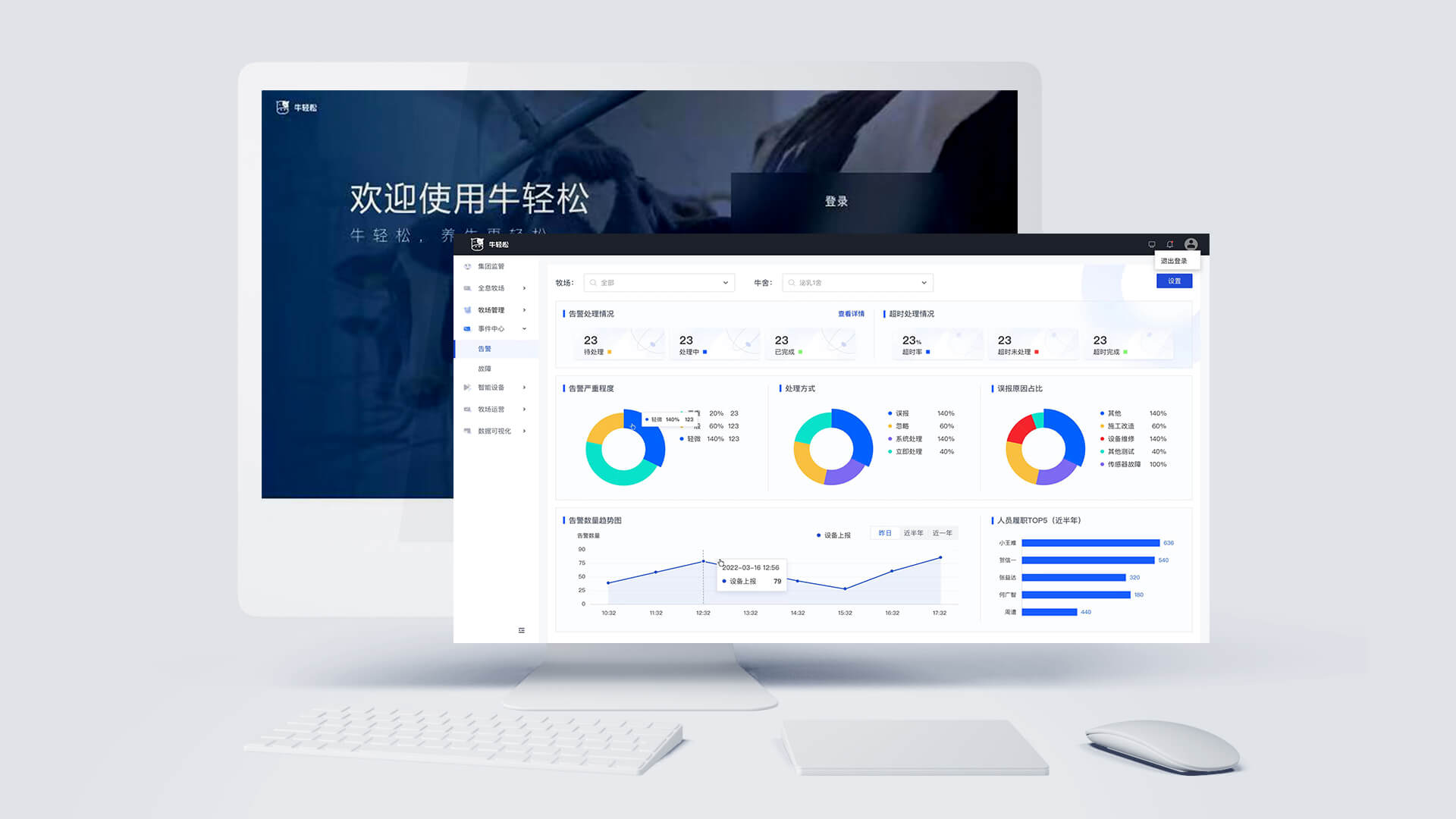 牛輕松對牧場的智能風(fēng)機(jī)系統(tǒng)、噴淋系統(tǒng)、視頻監(jiān)控系統(tǒng)、智能照明系統(tǒng)、能源監(jiān)測系統(tǒng)、環(huán)境監(jiān)測系統(tǒng)、工單系統(tǒng)等進(jìn)行統(tǒng)一的管理與聯(lián)動(dòng)配置。產(chǎn)品的應(yīng)用實(shí)現(xiàn)牧場內(nèi)所有設(shè)備的一鍵全連、協(xié)同聯(lián)動(dòng)及可視化管理,輔助牧場能夠綠色的、高效的、可持續(xù)盈利的長足發(fā)展。